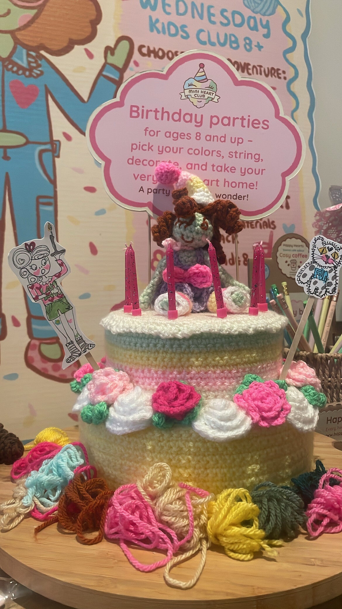 De Mini Heart Club is een creatieve plek waar kinderen in kleine groepjes met wol en vrolijke hartjes werken.
